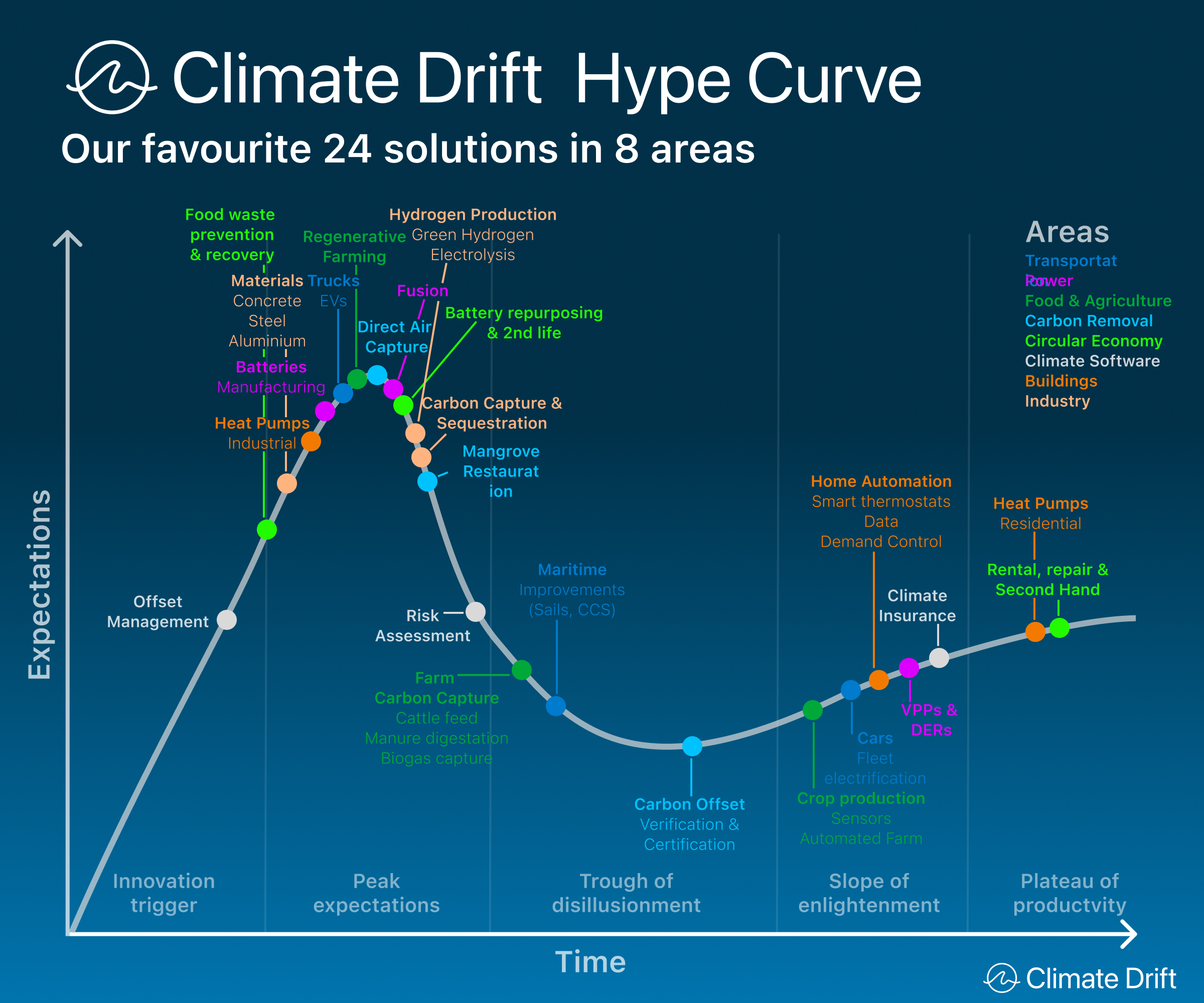 Regrettably/Fortunately, this article serves merely as an introduction to the hype cycle. In subsequent pieces, we will delve further into solutions, formulate thesis statements for each sector, from Decarbonizing Shipping to Battery Lifecycle Management, and then position these technologies on the hype curve.