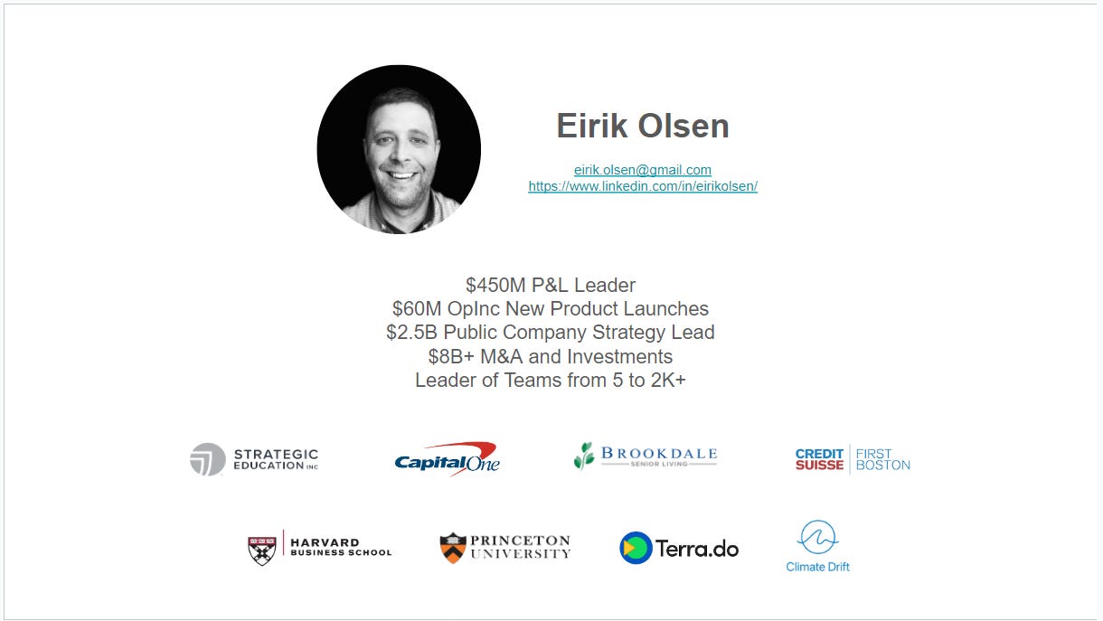 Eirik is an executive with over 20 years of experience in strategy, growth, operations, and finance across diverse sectors like education, finance, and real estate. He is currently a fellow at the Climate Drift Accelerator.