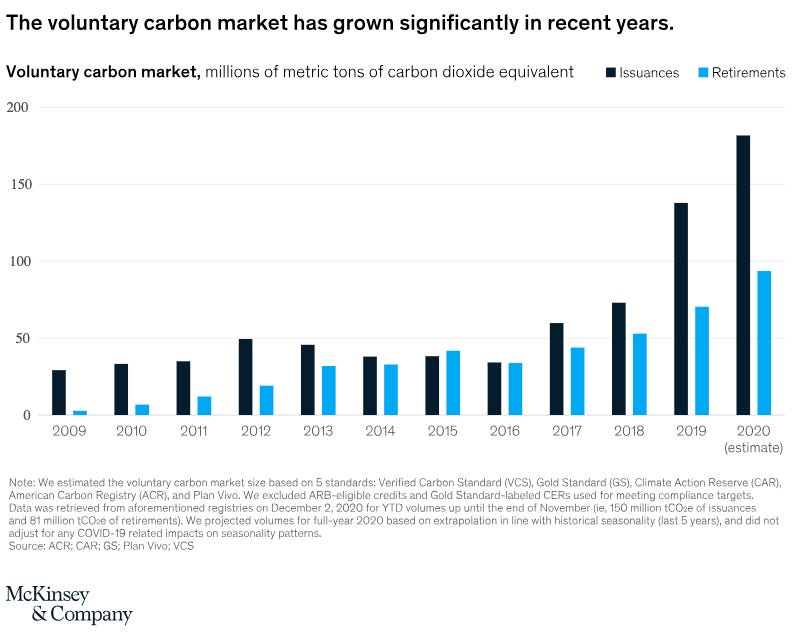 What's surprising about the voluntary carbon market is that despite the significant media coverage, it remains relatively small in scale. In fact, the total amount of offsets from 1988 to 2005 was about $300 million. Since then it has grown: Last year, in 2022, its transacted value was a few billion dollars.