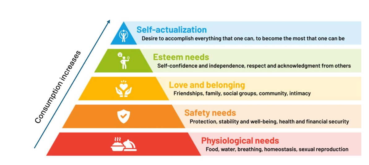 To understand consumption we need to understand the core of human needs as explained by the Pyramid of Maslow.. Consumption increases as one’s need is fulfilled towards the top of the pyramid.