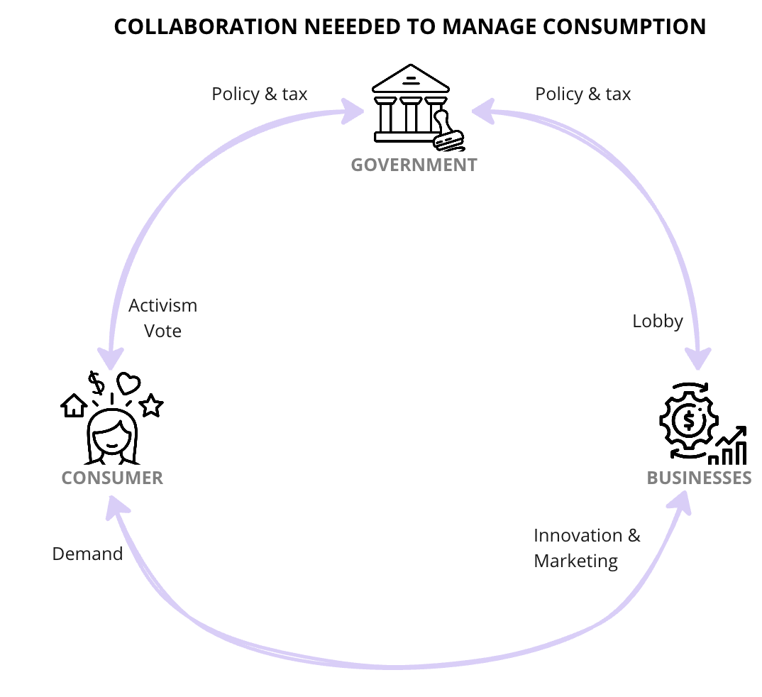 To slow down and manage consumption we need consumers, businesses, and government to collectively take action and hold each other accountable: [This is illustrated by the above visual]