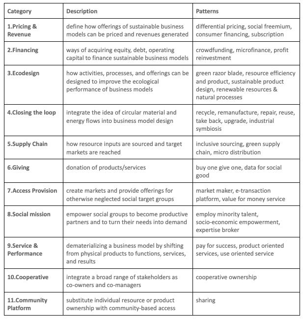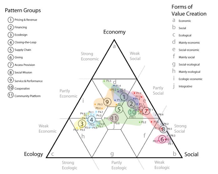 A framework created by Florian Lüduke-Freund helps us understand the different possibilities to create sustainable business models from the lens of 3 dimensions: Economic, Ecological and Social value creation. In total there are 45 patterns which are categorised in 11 groups.