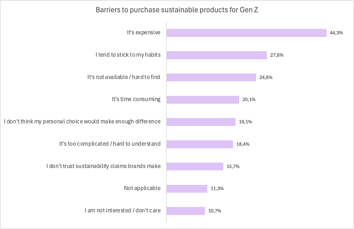 Unlike Millennials, this generation is growing up in economic and political instability, on top of that having experienced global pandemics at an early age. This has shaped the way Gen Zers view their consumption and relationship with brands. According to a 2022 research climate change remains the biggest concern among Gen Z for the next five years. When we look at their consideration phase, sustainability and ethics are at the top of their list, however this somehow doesn’t always translate into their purchasing behaviour. To better understand the challenges, here are the top barriers preventing Gen Z from purchasing sustainable options: