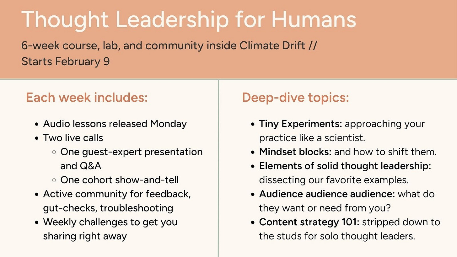 Starting mid February, Katie will be running a six-week program inside Climate Drift called Thought Leadership for Humans.
