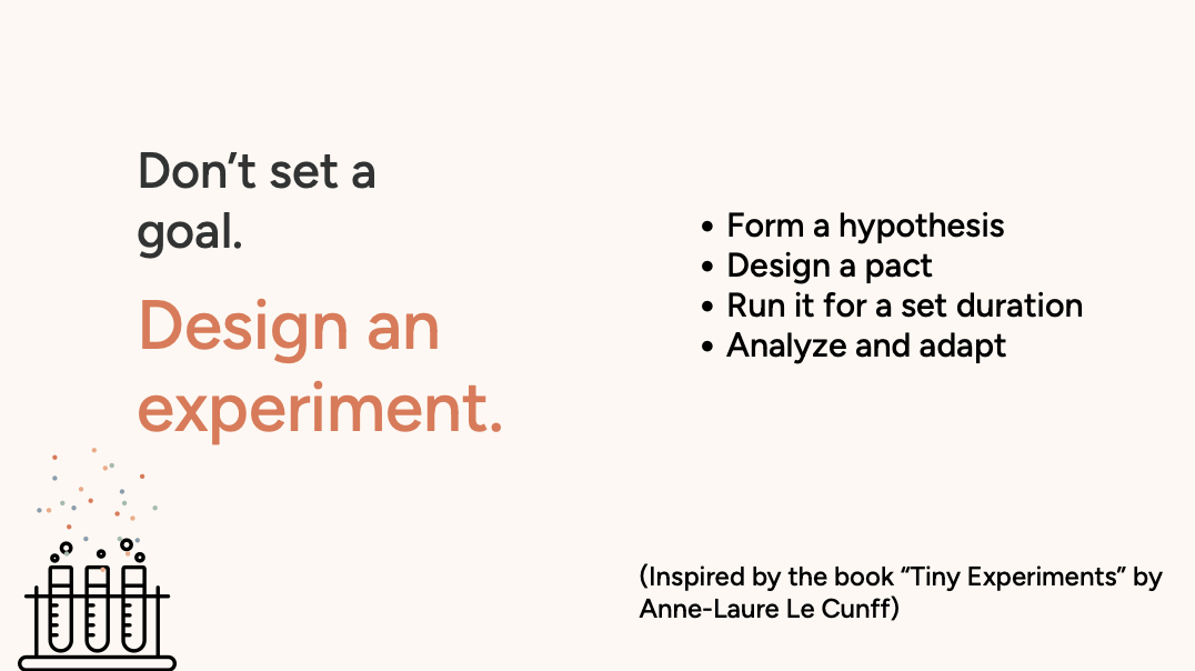 Here’s the mindset shift that makes this sustainable: Don’t set goals. Design experiments.