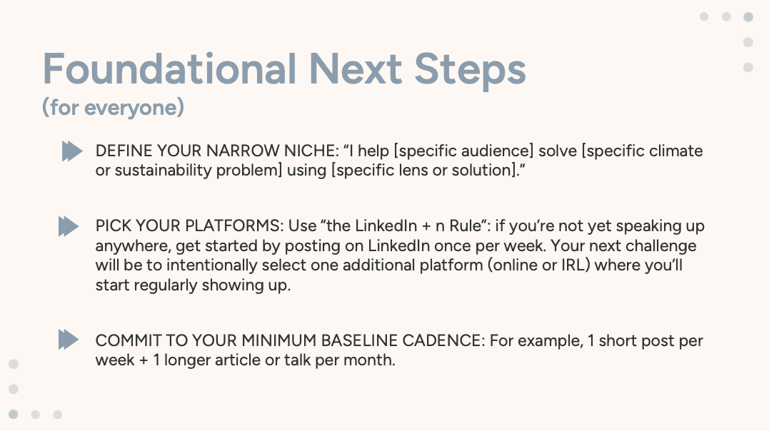 Define your audience. Complete this sentence: “I help [specific audience] solve [specific climate problem] using [specific lens or solution].”