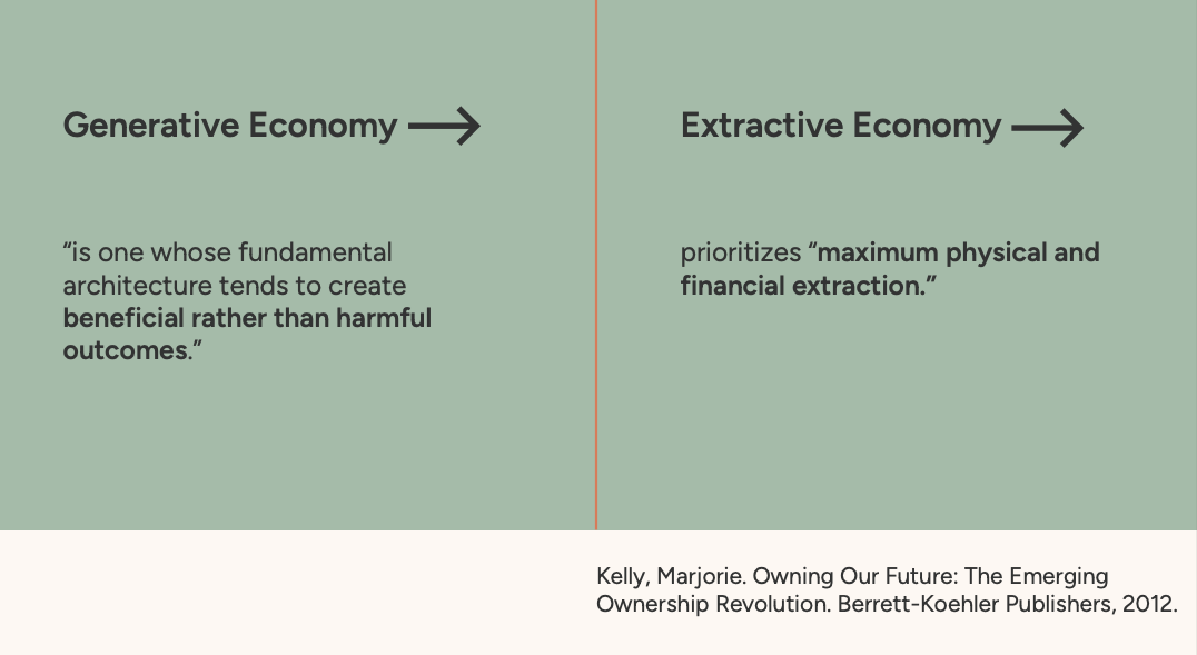 In her book Owning Our Future, researcher Marjorie Kelly distinguishes between a generative economy (one whose fundamental architecture creates beneficial outcomes for all life) and an extractive economy (one that prioritizes maximum physical and financial extraction for the benefit of a few).