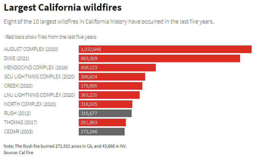 …Eight of the 10 largest wildfires in California history have occurred in the last five years.