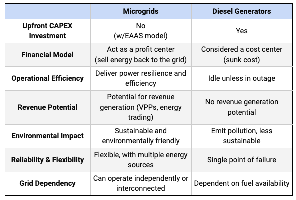 Microgrids offer a shift towards an economically favorable model with enhanced operational efficiency, revenue potential, and sustainability — when compared to diesel generators, which can be seen as cost centers with limited flexibility and a higher environmental impact.