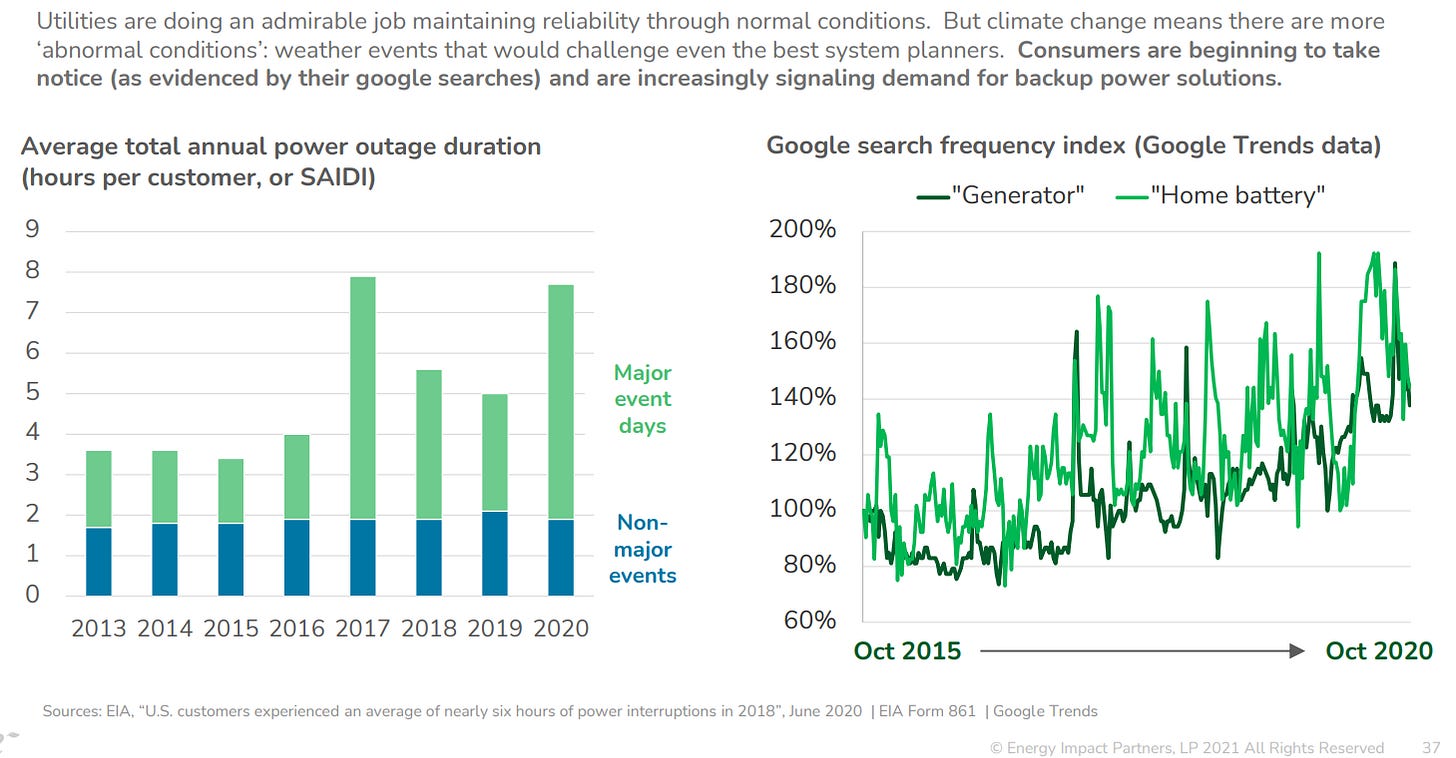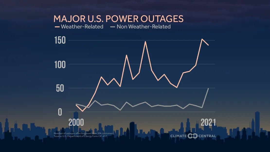 At the same time that electricity demand is doubling (creating grid capacity needs), the increasing frequency of extreme weather events is putting tremendous strain on the grid, resulting in a growing number of power outages across the country.