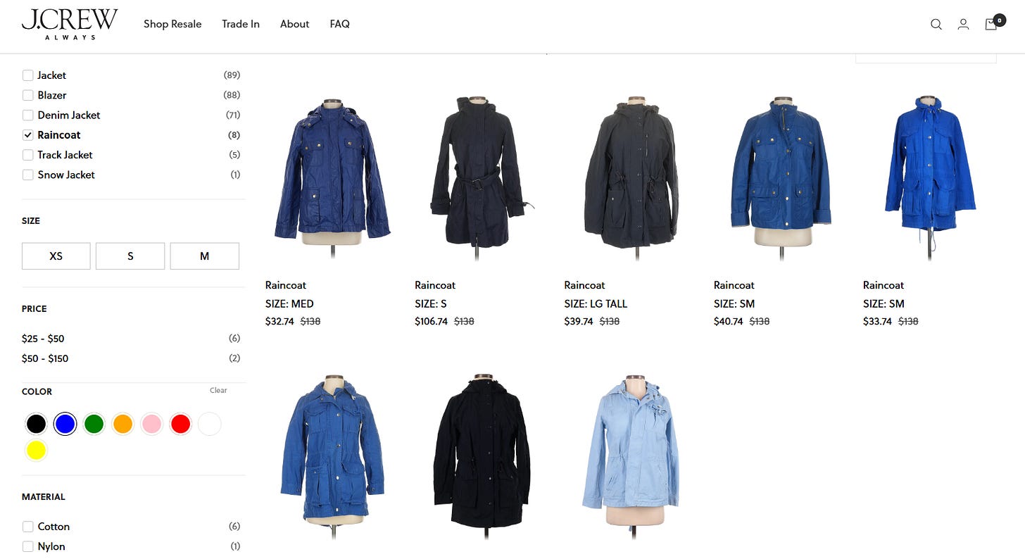 The J.Crew subsite on ThredUp platform allows users to use various filters to sift through J.Crew products in ThredUpâs inventory. Image source: J.Crew Resale