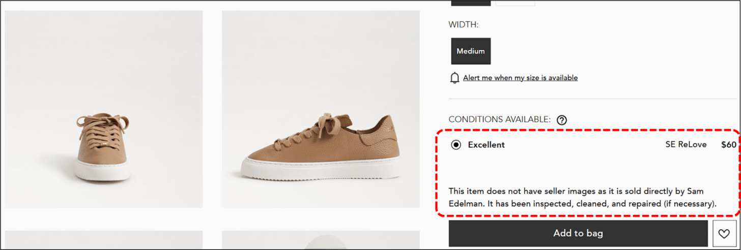Sam Edelman sells brand inventory on its resale site alongside P2P offerings. Sam Edelman communicates to the shopper that products coming from the brand itself (versus a P2P seller) have been inspected, cleaned and repaired (if necessary). Image source: Sam Edelman ReLove