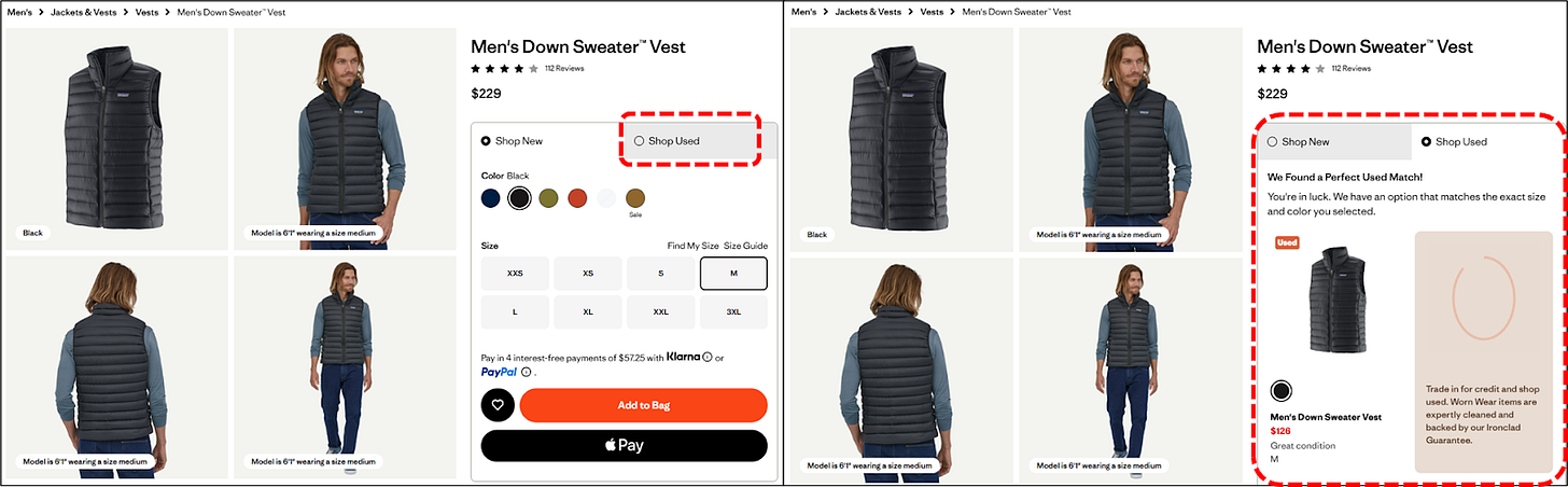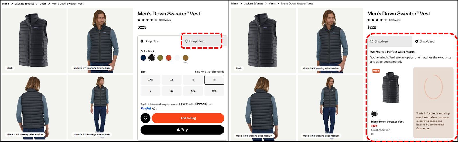 Patagoniaâs integration of secondhand goods alongside new products on its mainline site, leveraging Troveâs plug-in. Image source: Patagonia