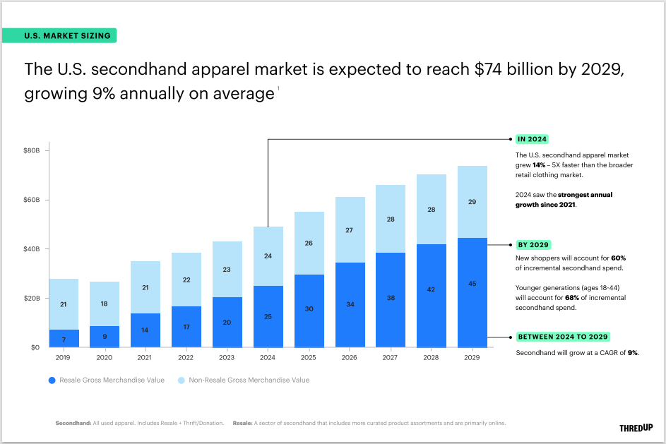 In 2024, the US secondhand apparel market grew 14%, 5x faster than the broader retail clothing market, and is projected to grow at a CAGR of 9%. Source: 2025 ThredUp Resale Report