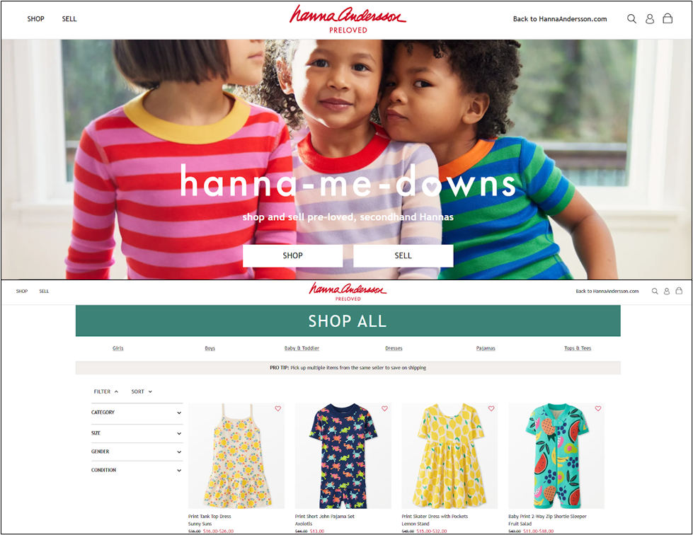 The Hanna Andersson resale site retains the look and feel of its mainline site. The shopper is able to apply relevant filters such as category, size, gender and condition. Image source: Hanna Andersson Preloved