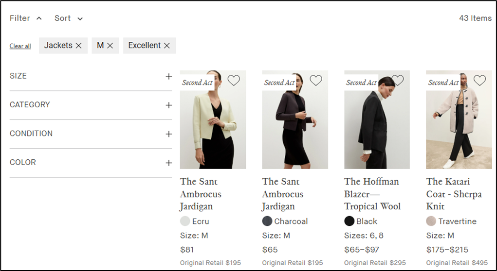 Online branded resale provides the option to give shoppers a consistent, if not seamless, shopping experience with their mainline site. The branded resale platform itself is usually on a âsub-siteâ, a separate website hosted by a company like Archive or Trove, that retains the look and feel of the brand (see M.M. LaFleur, below). Consumers are able to apply filters, as they would on the mainline site, such as product category, size, color as well as resale specific filters like condition of the product. A future iteration of resale will see resale items listed on the main ecommerce site alongside their new offerings; early adopters such as Patagonia have already integrated this capability (see below).
