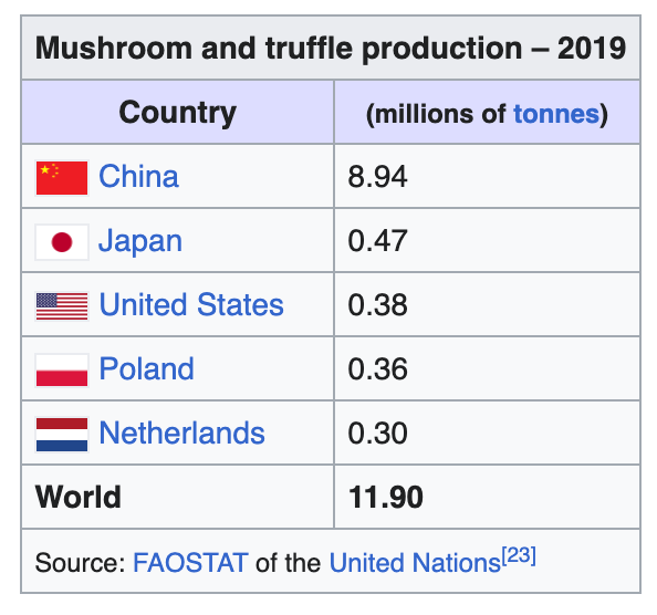In 2019, world production of commercial mushrooms and recorded truffle collection reported to the Food and Agriculture Organization was 11.9 million tonnes, led by China with 75% of the total.