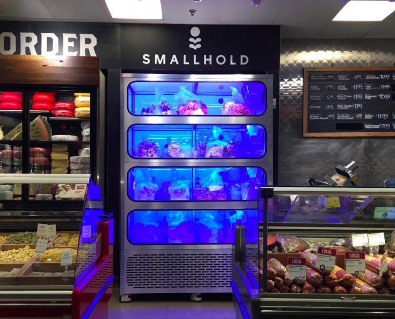 In 2022, Smallhold took its concept of farm-to-table even further by installing "mirco farms" directly in markets. These eye-catching units are constructed from glass and metal and emanate a blue glow, giving them a futuristic appearance. More than just aesthetically pleasing, these minifarms serve a functional purpose. They allow mushrooms to be grown and harvested on-site, ensuring peak freshness and minimal transit time from farm to consumer.